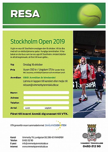 Vi gör en resa till Stockholm Open i sammarbete med smålandsidrotten onsdagen den 16 oktober. Vill du åka med och se världsstjärnorna spela i Kungliga tennishallen. Vi har bokat en stor buss som tar oss upp till Stockholm. Antalet biljetter är alltså begränsade, så först till kvarn gäller…