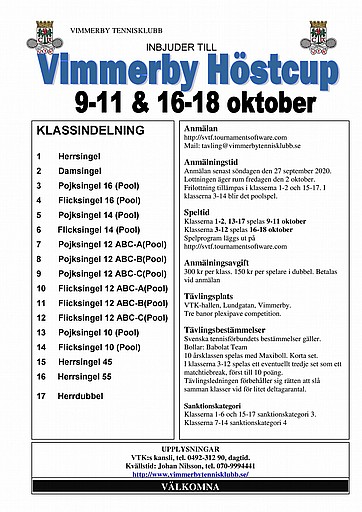 Vimmerby Höstcup spelas 9-11 och 16-18 Oktober 2020. Sista dagen för anmälan är 27 September.