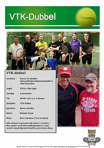 Lördagen den 2 november klockan 10.00 spelar vi en dubbelturnering i VTK-Hallen. Anmälan senast 31 oktober.